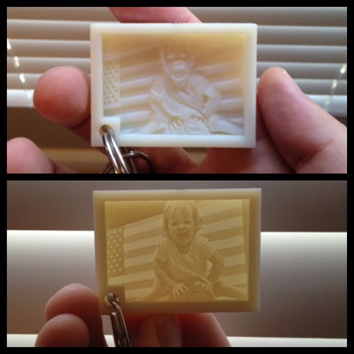 Инженеры Тайлер Ватсон (Tyler Watson) и Зак Каубл (Zach Kauble) решили возродить старинное искусство литофании – создания на тонком фарфоре углубленных изображений методом обратного рельефа. Такие изображения мало заметны при обычном освещении, но хорошо видны на просвет, за счет игры света и тени. Свой замысел они воплотили в проекте под названием «Print 3D For Me». Чтобы снизить себестоимость готовых изделий, инженеры заменили изысканный фарфор экономичным пластиком, а сложную ручную технологию производства литофанических изделий трехмерной печатью.