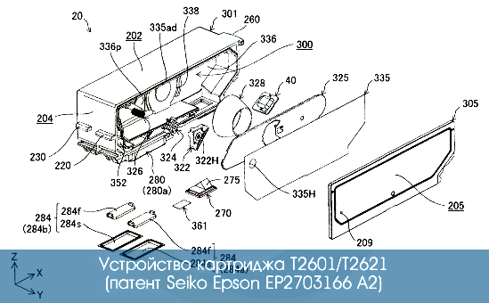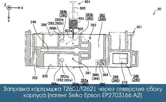 Чтобы защитить свои решения от восстановленных картриджей, производителей совместимой продукции и компаний, специализирующихся на заправке, компания Epson чаще всего патентует не только чипы и чернильницы, но и способы их заправки после первого использования. Патент EP2703166 от 05.03.2014, опубликованный в Европейском патентном реестре, описывает как устройство чернильницы, так и порядок сборки пластиковых частей, инструменты для перезаправки и алгоритм применения заправочного набора для картриджей № 26 Black (артикул C13T26014010) и № 26XL Black (артикул C13T26214010).