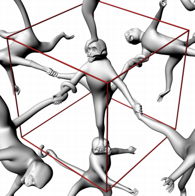 В качестве четырёхмерного объекта учёные взяли куб с гранями-мартышками, которые держат друг друга за хвосты и лапы. В четырёхмерном измерении, непостижимом для человеческого восприятия, все мартышки одинакового размера, но проекция в трёхмерное пространство изменяет пропорции животных, в результате чего одни особи выглядят крупными, другие мелкими.