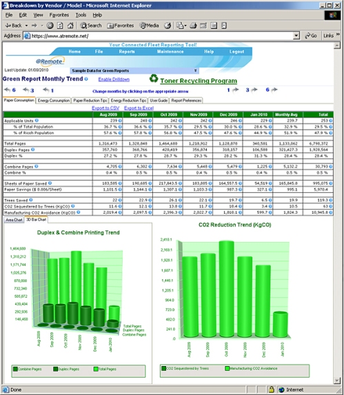 Во всех версиях программы доступна полезная функция @Remote Green Reports для создания экологических отчётов с данными о выбросах CO2, уровне потребляемой электроэнергии и бумаги, а также об изменении перечисленных параметров в результате оптимизации парка печатной техники.