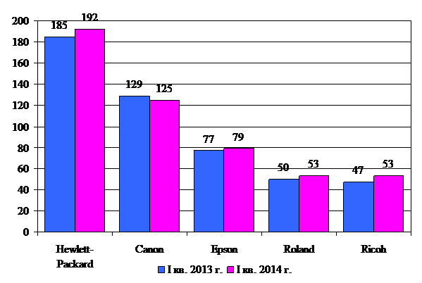 Из таблицы видно, что на мировом рынке плоттеров устойчиво лидирует компания Hewlett-Packard, доля которой в I кв. 2013 г. составила 24,1 г., а в I кв. 2014 г. она выросла на 0,1 % и достигла 24,2 %.