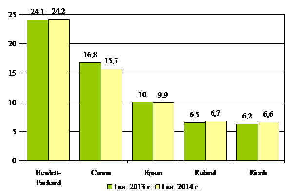 Брендовая структура рынка широкоформатных принтеров в I кв. 2013 г. и I кв. 2014 г.