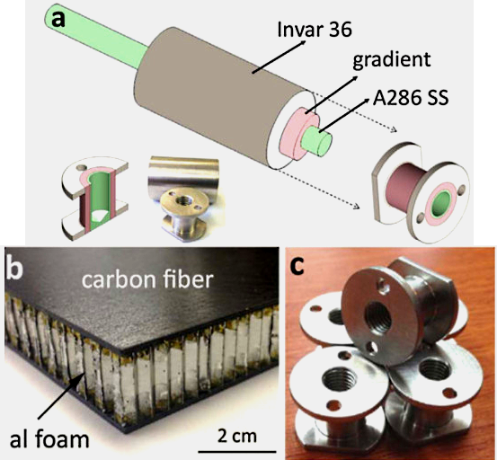 Металлические детали с градиентной структурой могут быть полезны для соединения конструкций, отличающихся друг от друга по физическим свойствам, к примеру, по коэффициенту температурного расширения. Недавно из такого многослойного сплава ученые изготовили крепление для углепластиковых панелей, применяемых в космонавтике, которые представляют собой листы углепластика с проложенными между ними алюминиевыми сотами. Крепление было изготовлено в виде втулки, внутренняя часть которой напечатана из стали, а наружная из инвара. Стальная резьба на внутренней стороне соприкасается со стальным винтом, а внешняя сторона – с углепластиком. Плавный переход между сталью и инваром позволяет предотвратить растрескивание деталей при резких скачках температуры, которые характерны для открытого космоса.