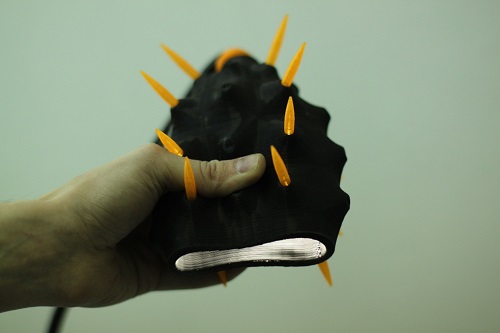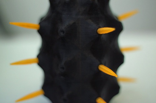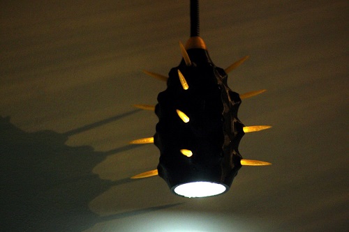 Изначально мы планировали отлить светильник с полупрозрачными шипами. Но в процессе работы мы решили не отливать шипы, а просто напечатать их на 3D-принтере и вставить в заранее подготовленные отверстия. В готовое изделие вставляем лампочку и любуемся результатом: