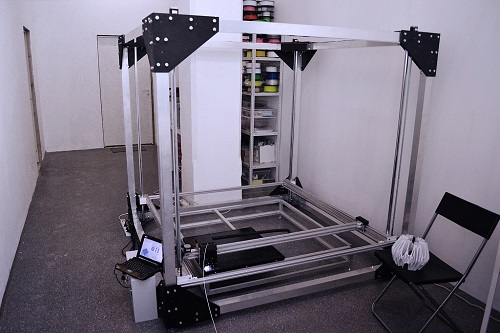 Для печати мы выбрали отечественный 3D-принтер Tsar («Царь») с диаметром сопла 1 мм и областью печати 1,2х1,2 м. Признаюсь честно, печатать такую маленькую штуку на таком гигантском принтере было немного смешно. Для наглядности приведу фотографию нашего гигантского принтера: