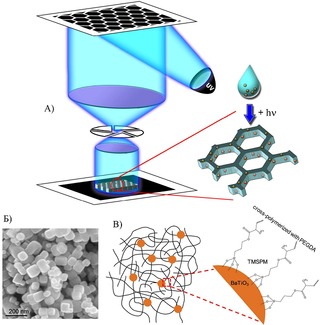 На следующем рисунке под буквой «А» показана схема оптической 3D-микропечати, которая позволяет создавать структуры с разрешением в несколько микрон. Под буквой «Б» представлены сами кристаллы титаната бария. Под буквой «В» показана схема привязки нанокристаллов к матрице.