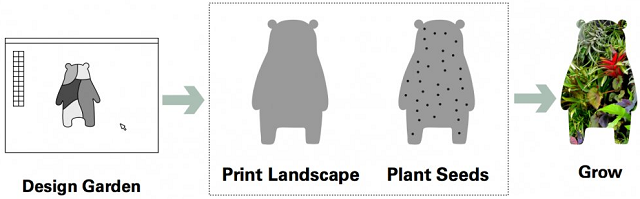 Для создания необычных садов Такеучи предлагает использовать технологию 3D-печати. Сначала он создает цифровую модель будущего объекта в графическом редакторе, а затем распечатывает ее на 3D-принтере с помощью специального расходного материала – бечевки, в которую впоследствии высеваются крошечные семена растений. Уже через пару недель напечатанный из бечевки объект превращается в великолепную зеленую лужайку. Разработчик утверждает, что с помощью нового метода можно получить газоны и клумбы любой формы, включая прямоугольные, треугольные, округлые или даже пандообразные, как на следующем рисунке:
