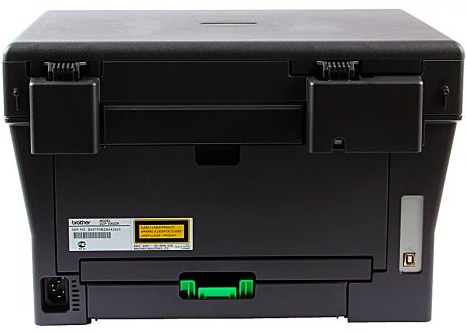 На задней стенке МФУ мы видим откидной лоток для извлечения застрявшей бумаги и стандартные разъёмы для подключения МФУ к сети и к персональному компьютеру.