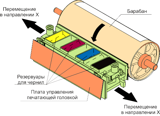 Печатающая головка по своей ширине совпадает с шириной барабана. Она оснащена алюминиевыми резервуарами, в которые стекают расплавленные чернила. Уровень чернил в резервуарах контролируется встроенными датчиками резистивного типа. В резервуарах чернила подогреваются до температуры 140°С, которая считается оптимальной для их распыления на носитель.