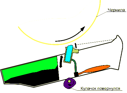 Во время переноса изображения на барабан кулачок поворачивается, отодвигая тампон и чистящее лезвие от его поверхности. Это необходимо для того, чтобы не размазать жидкие, ещё не застывшие, чернила по барабану.