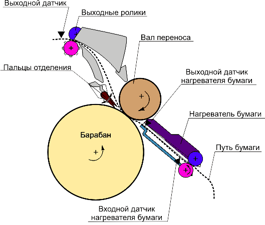 Далее в процесс вступают пальцы отделения, которые, приближаясь к поверхности барабана, отделяют от него верхний срез листа. При этом пальцы касаются только верхнего поля листа, так называемой «передней кромки», которая остаётся свободной от чернил. Затем пальцы приподнимаются над поверхностью барабана, пропуская лист с нанесённым на него отпечатком. Лист выводится из принтера при помощи выходных роликов. Процесс печати закончен.