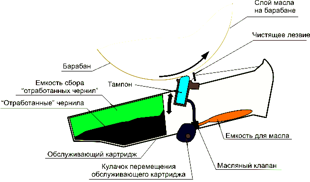 После того, как чернила с барабана перейдут на бумагу, обслуживающий картридж снова поднимается, а чистящее лезвие снимает остатки чернил, оставшиеся на поверхности барабана, и стряхивает их в бункер для отработки.